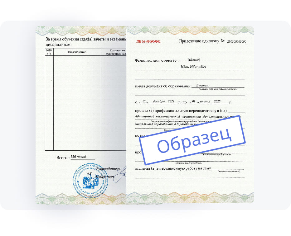 Диплом от нашего учебного центра равноценен диплому о высшем образовании. С ним вы сможете не только сменить сферу деятельности, но и значительно повысить уровень квалификации, что особенно важно для построения успешной карьеры.